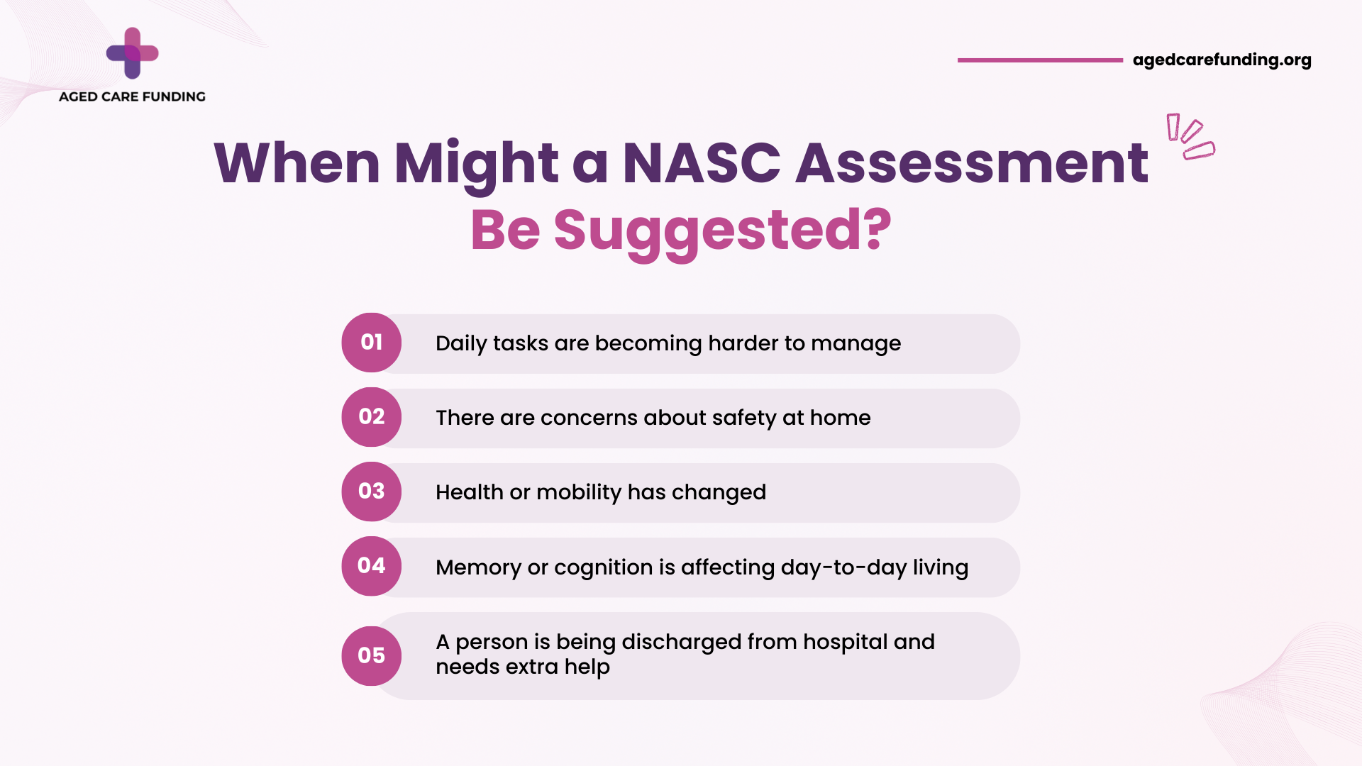Information about aged care funding is general in nature. Eligibility usually depends on individual circumstances and requires formal assessment through a NASC organisation. Support availability can change over time.