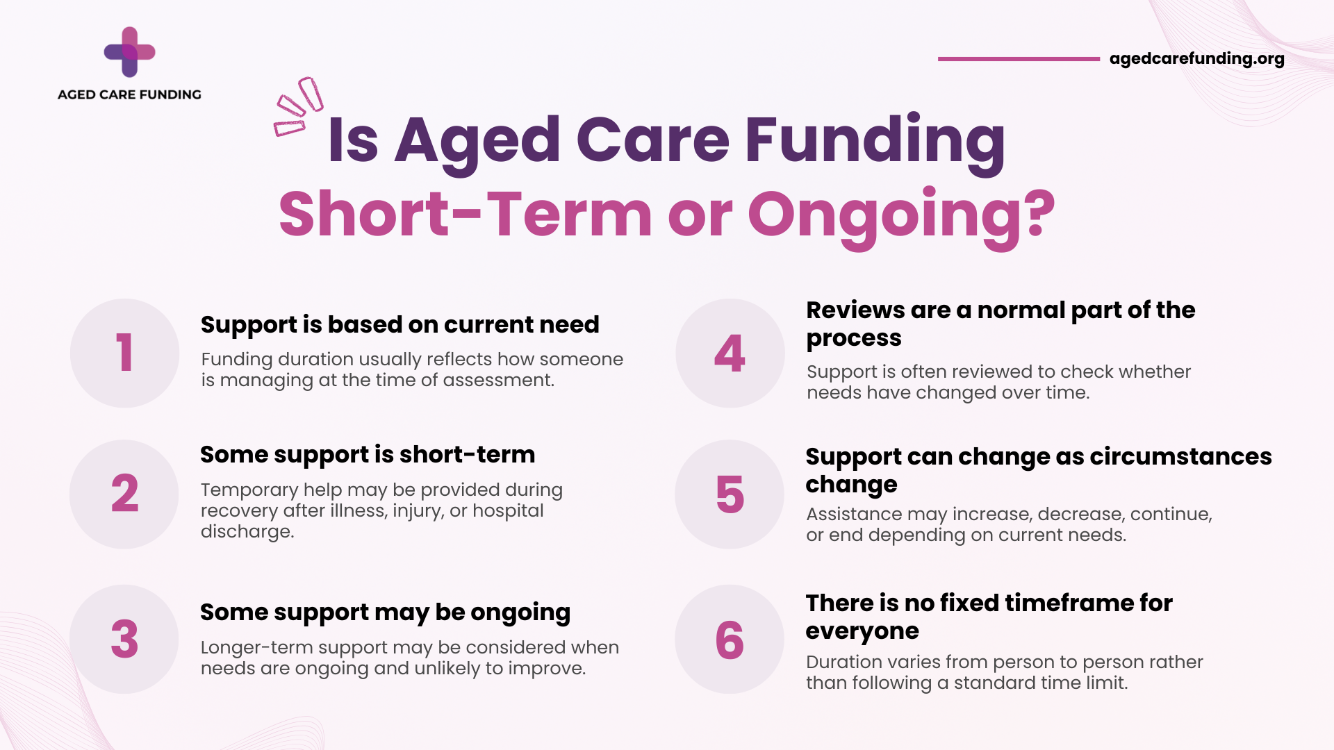 Aged care funding is typically based on current assessed need, rather than fixed timeframes.