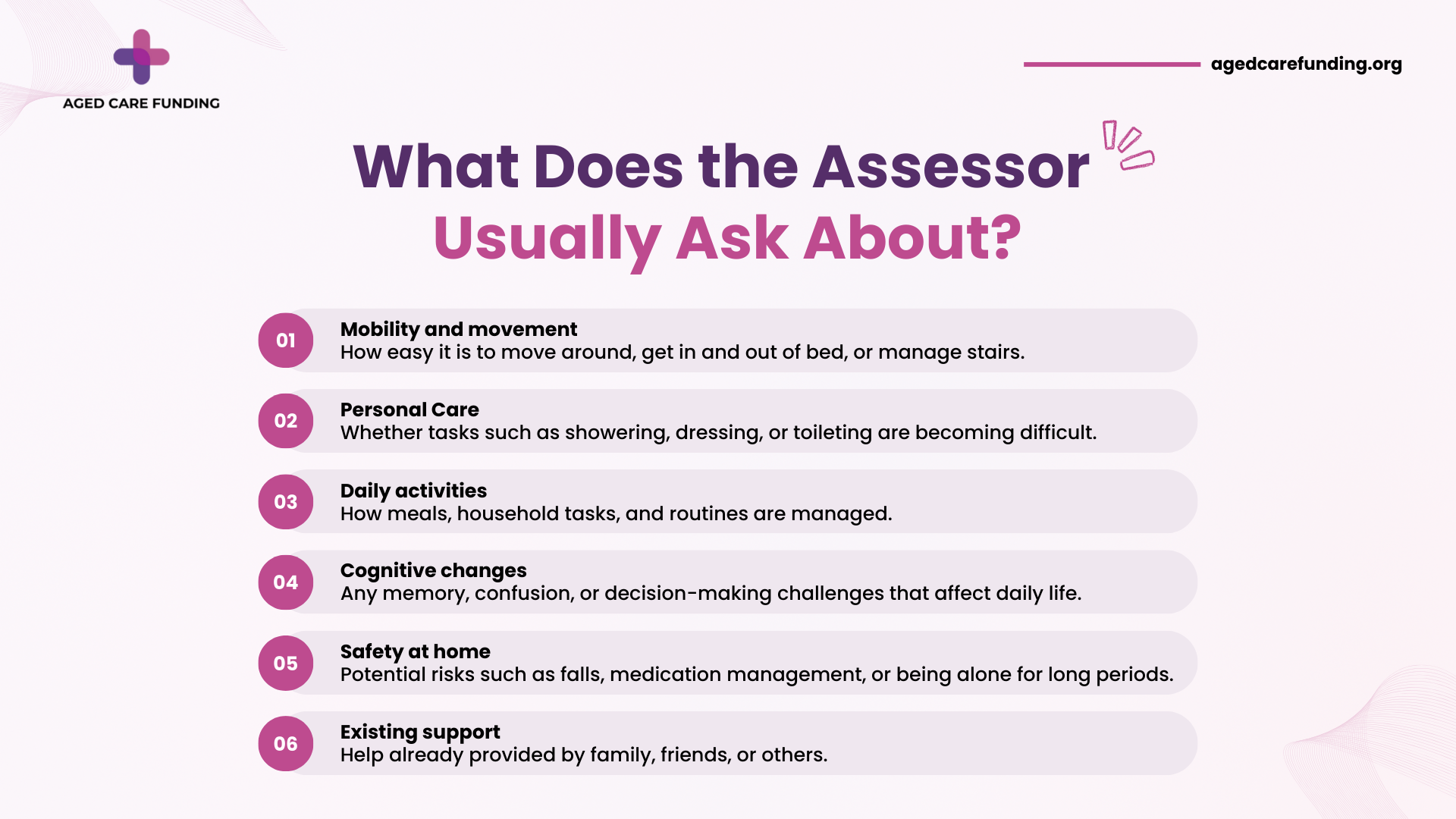 The assessment focuses on daily living rather than medical treatment. The assessor may ask questions about: